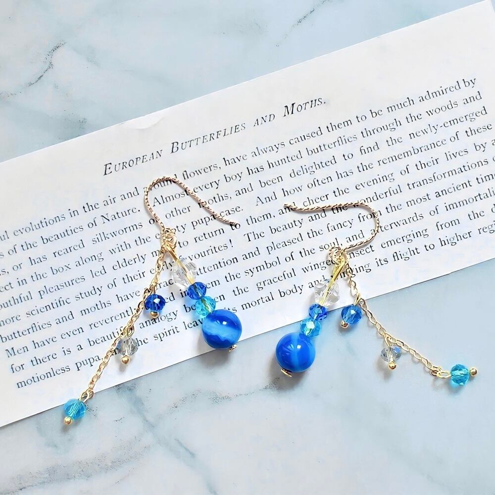 美しい耳元: ブルー瑪瑙 水晶 14kgf ピアス No.11