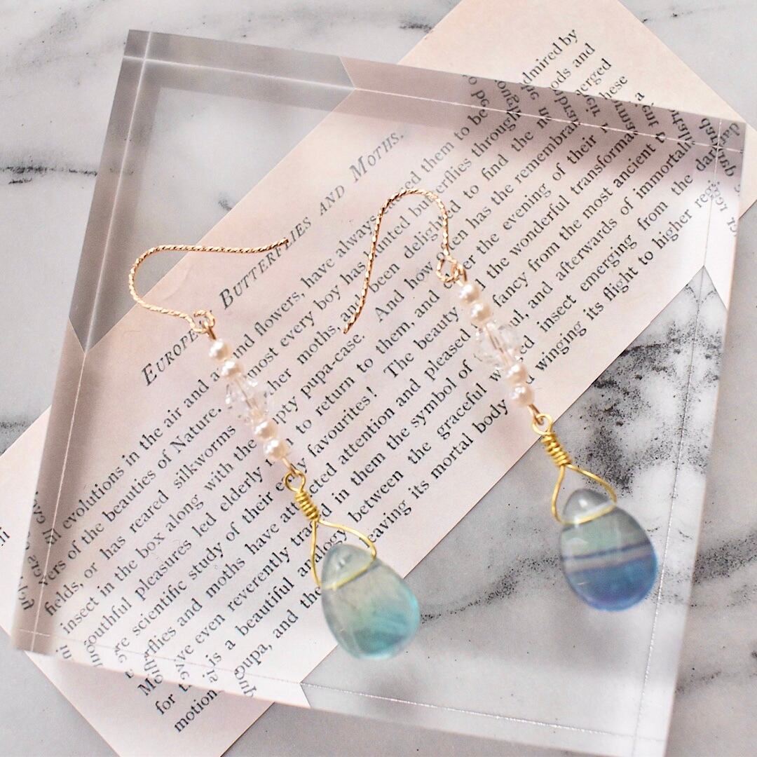 自然の美とクリアな輝き:マルチカラーフローライト 水晶 14kgf ピアス 耳飾り No.18 しずく型 雫