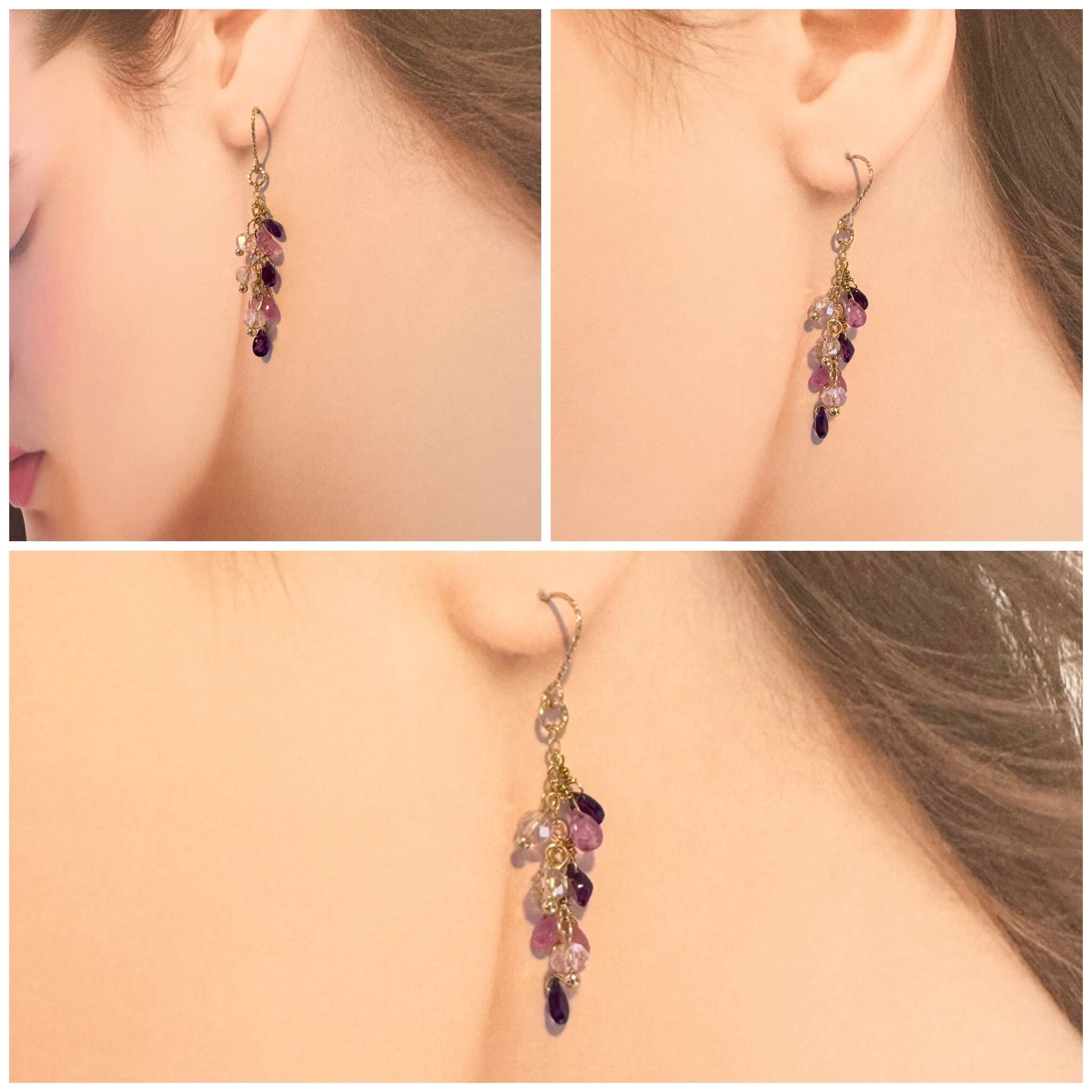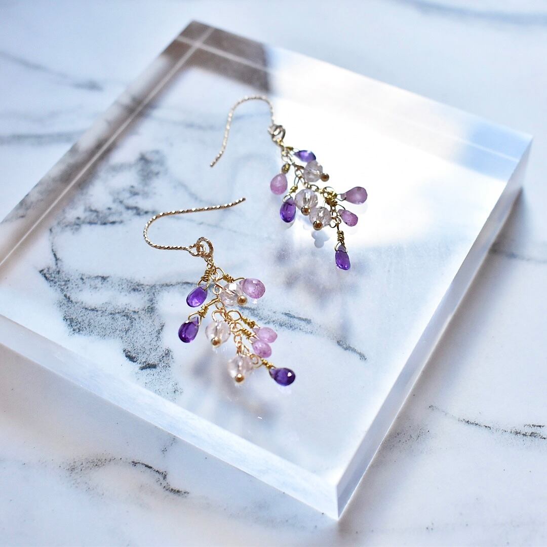 ロマンティックなツートーン:ピンクサファイア アメジスト 14kgf ドロップカット しずく 雫 ピアス 耳飾り No.25